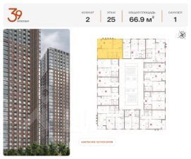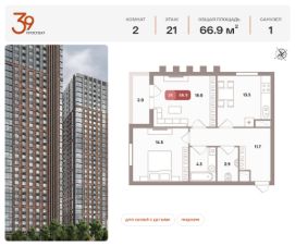 Продается двухкомнатная квартира в ЖК "Проспект 39" по адресу Москва, ЮВАО, Рязанский проспект, вл. 39, к. 2. Общая площадь квартиры - 66,90 кв.м., этаж 21. Стоимость квартиры - 25 467 703 р. Продаётся без отделки.
