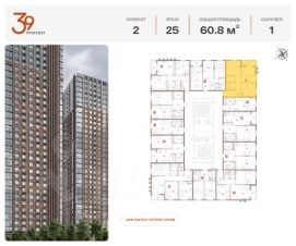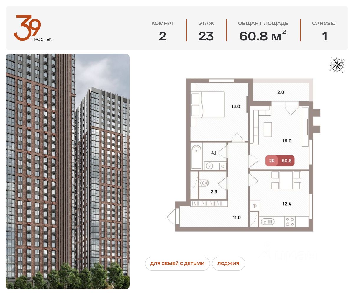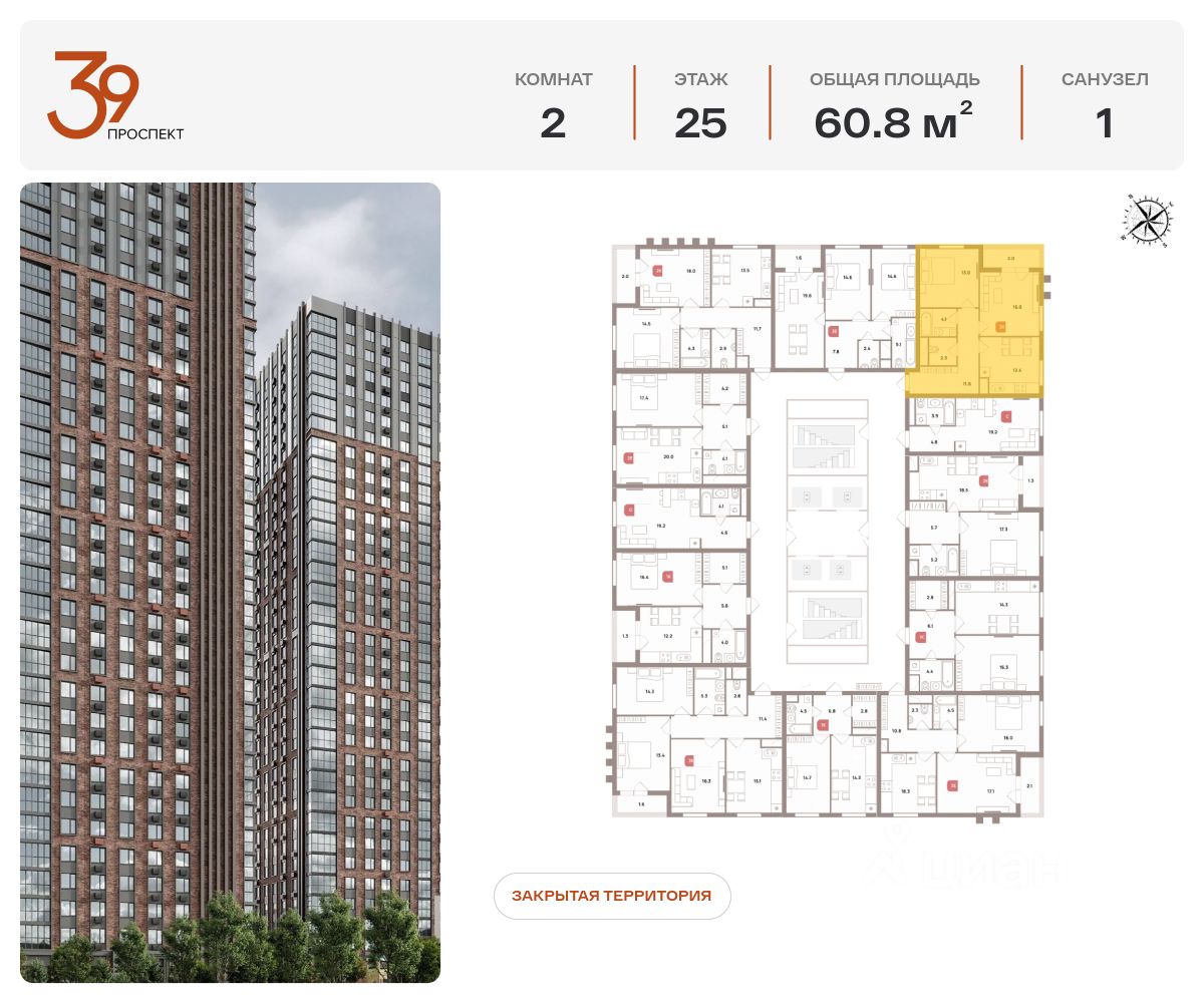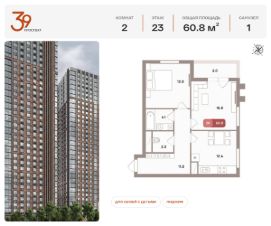 Продается двухкомнатная квартира в ЖК "Проспект 39" по адресу Москва, ЮВАО, Рязанский проспект, вл. 39, к. 2. Общая площадь квартиры - 60,80 кв.м., этаж 23. Стоимость квартиры - 23 948 381 р. Продаётся без отделки.
