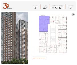 Продается четырехкомнатная квартира в ЖК "Проспект 39" по адресу Москва, ЮВАО, Рязанский проспект, вл. 39, к. 2. Общая площадь квартиры - 117,90 кв.м., этаж 29. Стоимость квартиры - 39 334 849 р. Продаётся без отделки.