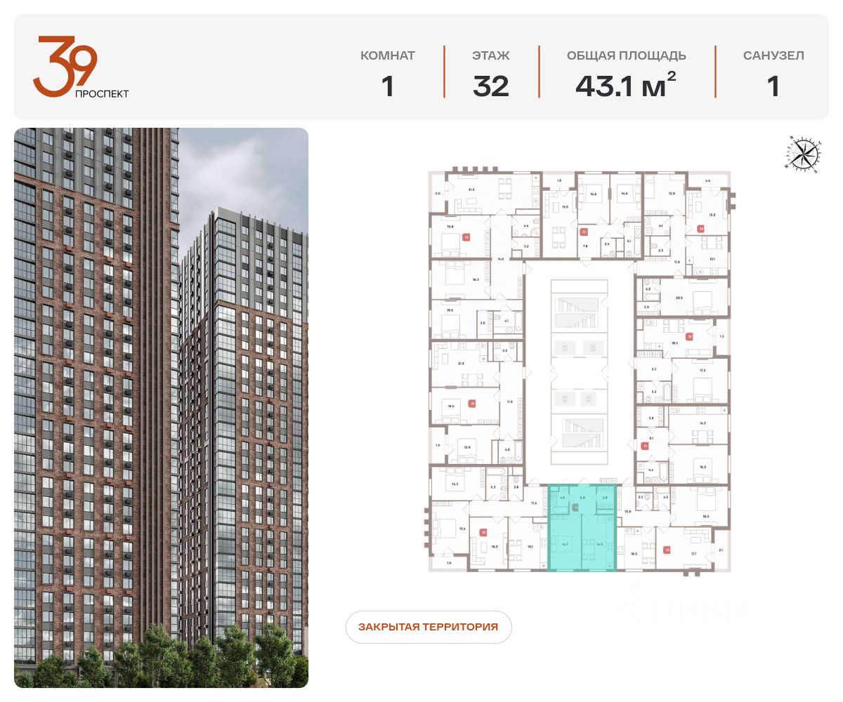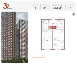 Продается однокомнатная квартира в ЖК "Проспект 39" по адресу Москва, ЮВАО, Рязанский проспект, вл. 39, к. 2. Общая площадь квартиры - 43,10 кв.м., этаж 31. Стоимость квартиры - 18 630 438 р. Продаётся без отделки.
