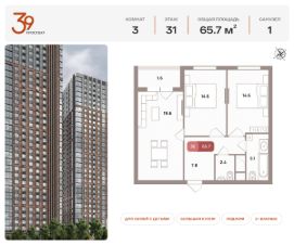 Продается трехкомнатная квартира в ЖК "Проспект 39" по адресу Москва, ЮВАО, Рязанский проспект, вл. 39, к. 2. Общая площадь квартиры - 65,70 кв.м., этаж 31. Стоимость квартиры - 26 363 999 р. Продаётся без отделки.