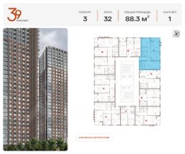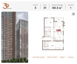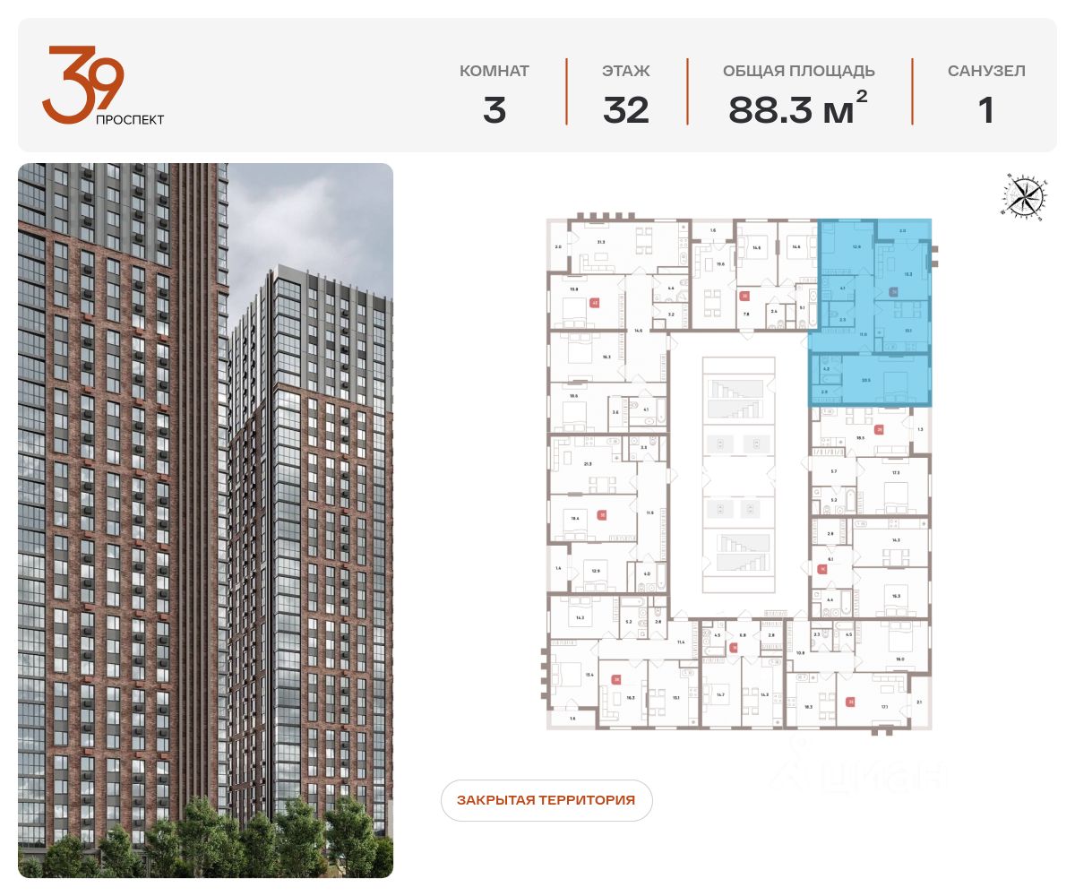 Продается трехкомнатная квартира в ЖК "Проспект 39" по адресу Москва, ЮВАО, Рязанский проспект, вл. 39, к. 2. Общая площадь квартиры - 88,30 кв.м., этаж 31. Стоимость квартиры - 34 641 253 р. Продаётся без отделки.