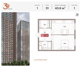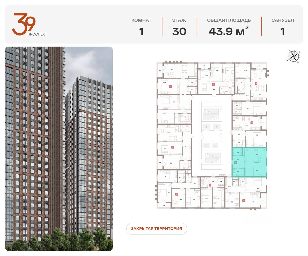 Продается однокомнатная квартира в ЖК "Проспект 39" по адресу Москва, ЮВАО, Рязанский проспект, вл. 39, к. 2. Общая площадь квартиры - 43,90 кв.м., этаж 31. Стоимость квартиры - 19 206 834 р. Продаётся без отделки.