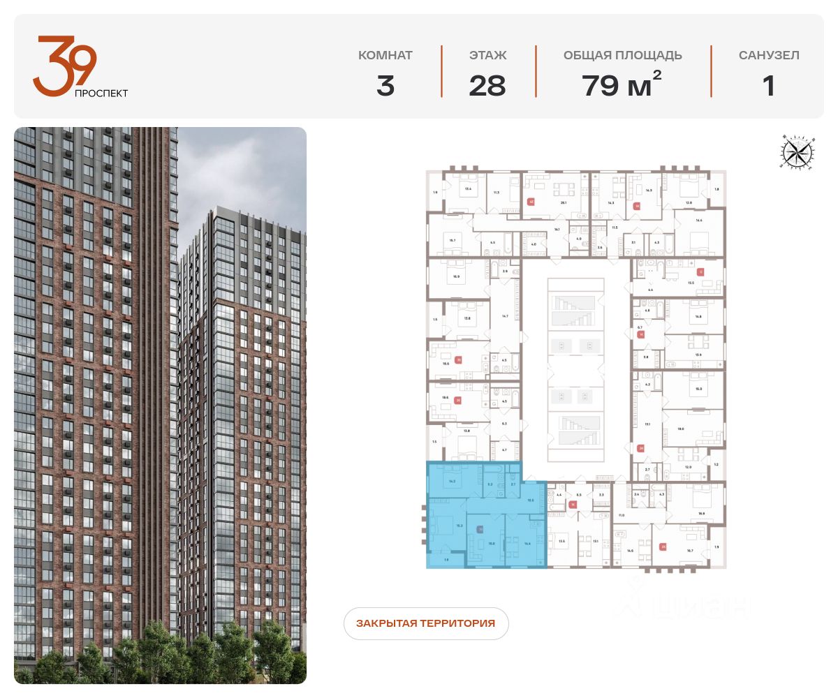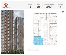 Продается трехкомнатная квартира в ЖК "Проспект 39" по адресу Москва, ЮВАО, Рязанский проспект, вл. 39, к. 1. Общая площадь квартиры - 79,00 кв.м., этаж 29. Стоимость квартиры - 26 869 724 р. Продаётся без отделки.