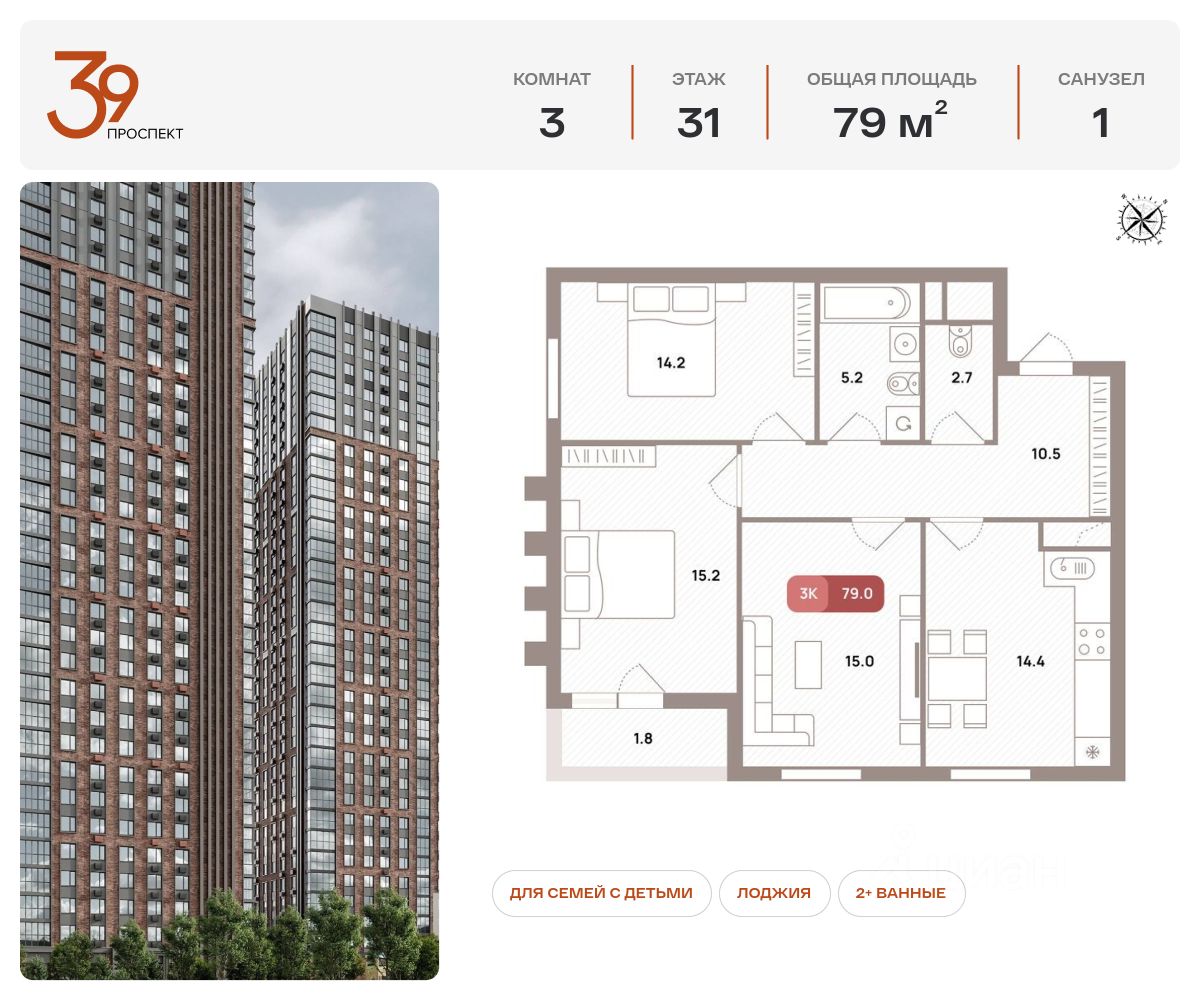 Продается трехкомнатная квартира в ЖК "Проспект 39" по адресу Москва, ЮВАО, Рязанский проспект, вл. 39, к. 1. Общая площадь квартиры - 79,00 кв.м., этаж 31. Стоимость квартиры - 27 778 202 р. Продаётся без отделки.