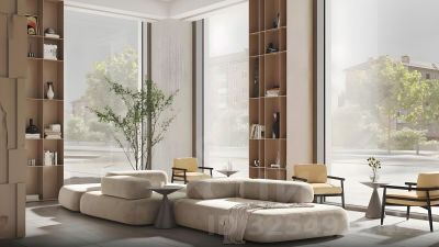 • дизайнерские лобби от бюро ABOVE ARCHITECTURE с панорамными окнами, интерьерами в теплой цветовой гамме и мягкой зоной ожидания располагаются в каждой башне;