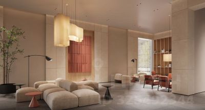 • дизайнерские лобби от бюро ABOVE ARCHITECTURE с панорамными окнами, интерьерами в теплой цветовой гамме и мягкой зоной ожидания располагаются в каждой башне;