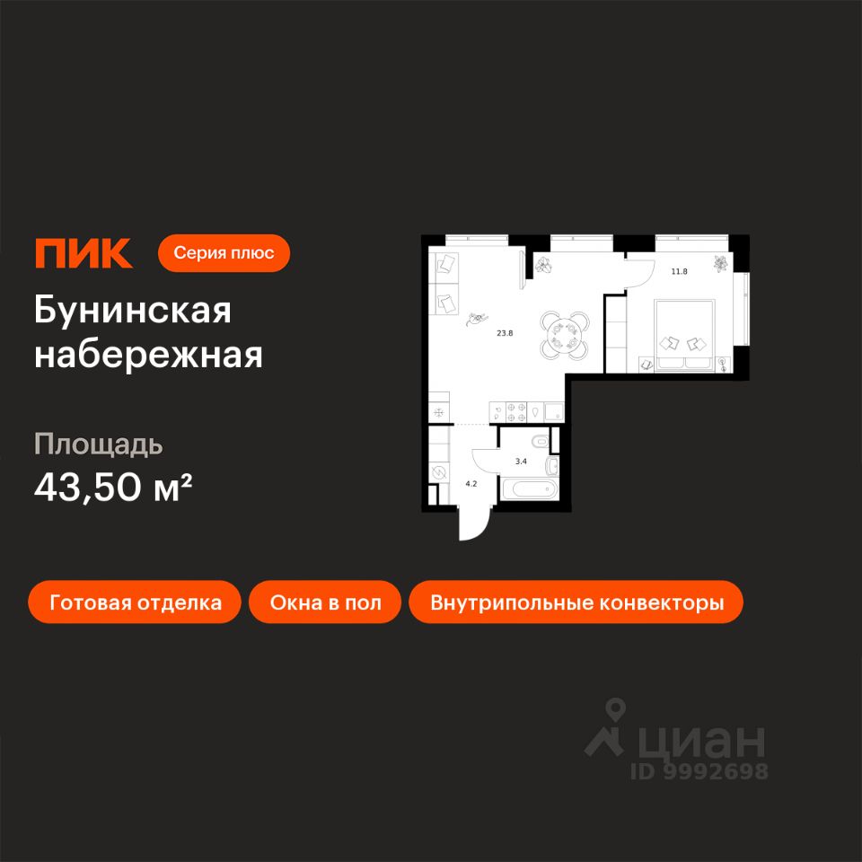 Продаётся 1-комн. квартира площадью 43,5 кв.м на 10 этаже 16 этажного дома (Корпус 2.6/1.1, Секция 1) проекта ПИК Бунинская набережная. Светлый просторный подъезд на уровне земли, функциональная планировка, большие окна, c отделкой.