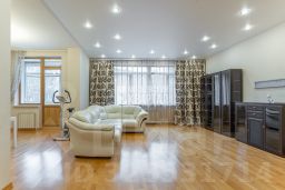 Квартира расположена в монолитно-кирпичном доме, окна выходят во двор на детскую площадку — тихо, зелено, безопасно. Планировка продумана до мелочей: большая гостиная для общения и приёма гостей, три изолированные спальни, кухня комфортного размера, два полноценных санузла, постирочная и гардеробная. Есть застеклённая лоджия. Пространство логичное, правильное, без потерь по метражу.