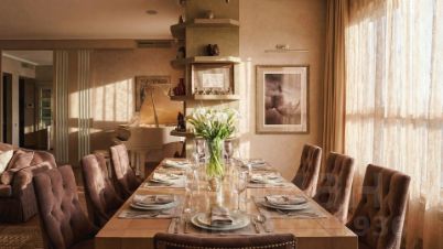 Планировочное решение: два входа в квартиру — основной и для персонала, просторная гостиная с зоной столовой, большая кухня с отдельным подсобным помещением, винно-сигарная комната, домашний кинозал, три спальни со своими санузлами и гардеробными, просторная игровая комната, кабинет, большой мастер-блок с просторной гардеробной и санузлом, постирочная комната, дополнительные гардеробные. В собственности 3 машино-места и келлер.