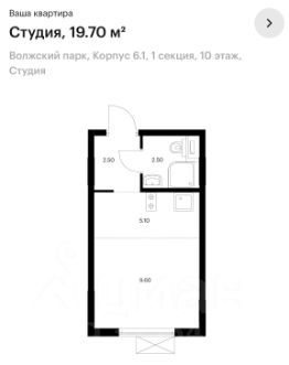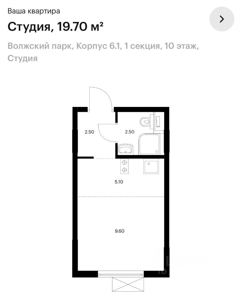 Площадь общая (фактическая) 19,7 кв.м: комната 9,6 кв.м, остальные помещения 10,1 кв.м. (Холл 2,50 кв.м; санузел 2,50 кв.м; кухня-ниша 5,10 кв.м). Готовая отделка от застройщика (расставить мебель и можно заезжать жить). Дом находится в тихой части района, окна не на хорду мсд, под окнами нет дорог с активным автомобильным движением, рядом располагаются наземные паркинги