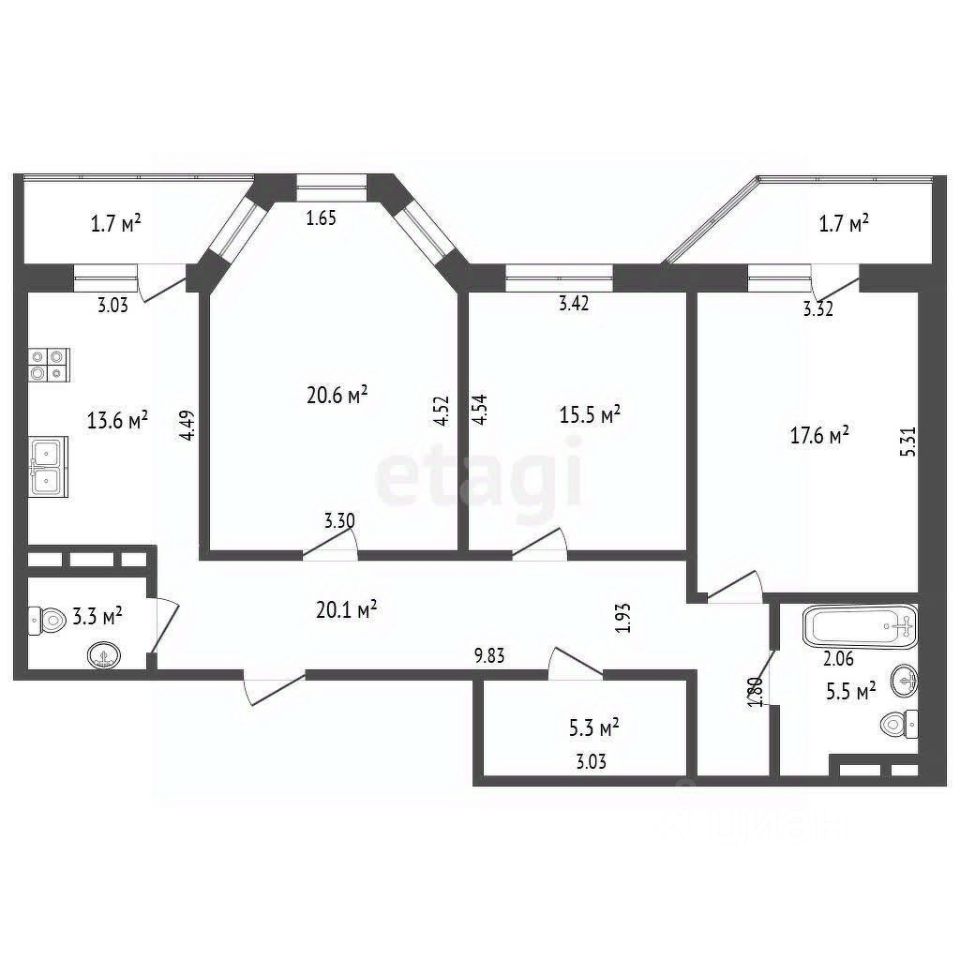 Просторная трехкомнатная квартира площадью 104,9 кв. м расположена на 16 этаже монолитного дома в районе Троицк по адресу: улица Дмитрия Кабалевского, 22. Жилая площадь составляет 53,7 кв. м, кухня — 13,6 кв. м, высота потолков — 2,8 метра.