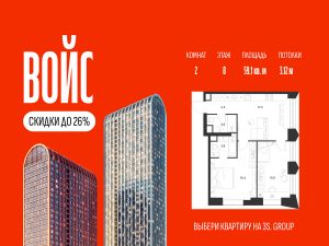 Продается уютная 2-комн. квартира площадью 59,1 кв.м на 8 этаже жилого комплекса бизнес-класса Войс. Общая площадь: 59,1 кв.м., жилая: 40 кв.м., площадь кухни-гостиной: 17,5 кв.м., высокие потолки: 3,12 м., санузел совмещенный.