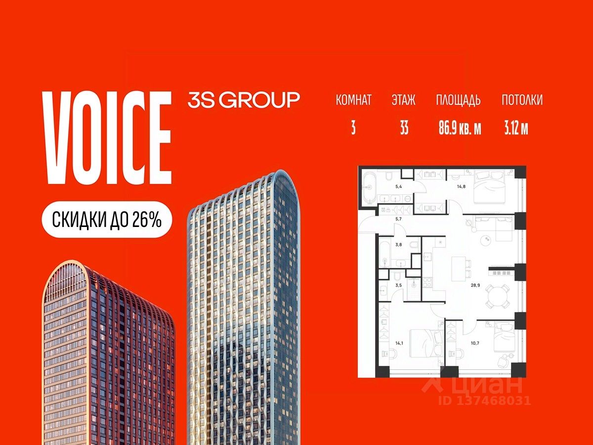 Продается уютная 3-комн. квартира площадью 86,9 кв.м на 33 этаже жилого комплекса бизнес-класса Войс от 3S Group. Общая площадь: 86,9 кв.м., жилая: 63,5 кв.м., площадь кухни-гостиной: 28,9 кв.м., высокие потолки: 3,4 м., санузел совмещенный.
