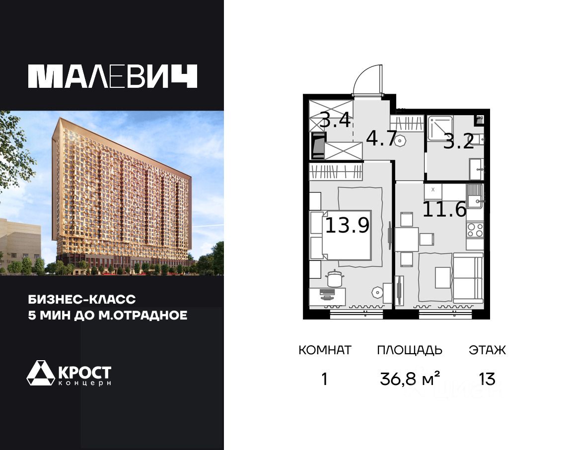Продаётся 1-к квартира 36.8 кв.м. на 13-м этаже 28 этажного дома.