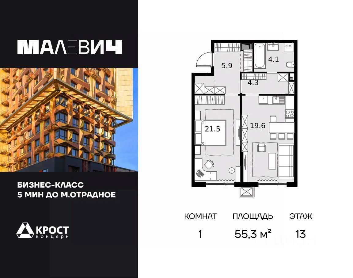 Продаётся 1-к квартира 55.3 кв.м. на 13-м этаже 28 этажного дома.
