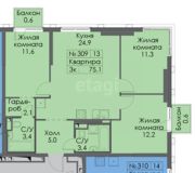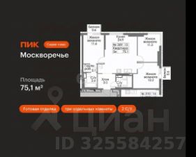 Общая площадь 75.1. кв.м. Есть балкон. Три раздельные комнаты и кухня гостиная 24.9.кв.м.