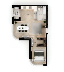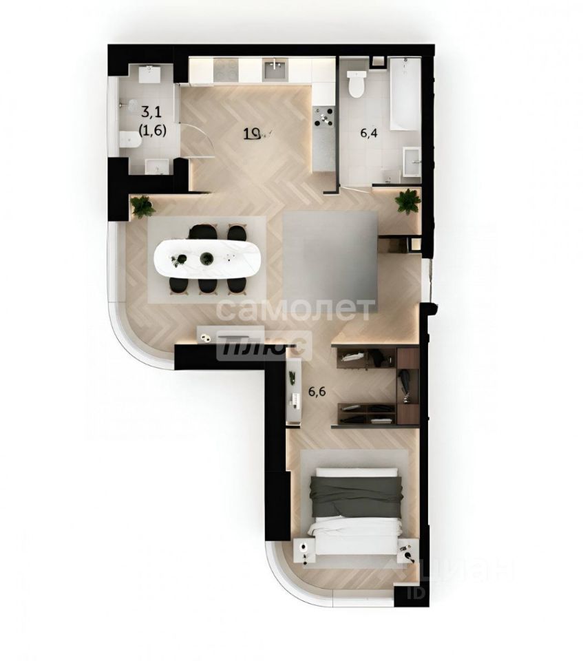 Планировочное решение: Формат 2Е с просторной кухней-гостиной, созданной для приема гостей, и изолированной мастер-спальней для приватного отдыха.