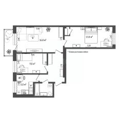 Планировка: Практичная и функциональная. Две изолированные спальни (9 м² и 13.8 м²) и просторная гостиная (16.8 м²).