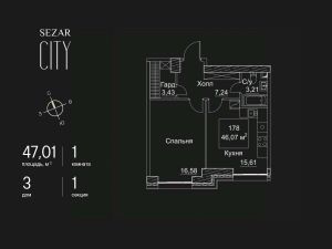 Продается 1-комнатная квартира в ЖК SEZAR CITY на 18 этаже. Общая площадь квартиры составляет 47,01 кв.м. Квартира без отделки. Срок сдачи - 2027 год.