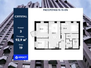 Однокомнатная квартира площадью 92,9 кв.м. на 19 этаже дома бизнес-класса "CRYSTAL Трилогия".