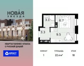 Продаётся 1-к квартира 22.4 кв.м. на 18-м этаже 22 этажного дома, корпус 6 - Резиденция "Хабаровск". Без отделки.