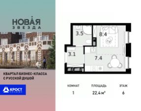 Продаётся 1-к квартира 22.4 кв.м. на 6-м этаже 22 этажного дома, корпус 6 - Резиденция "Хабаровск". Без отделки.