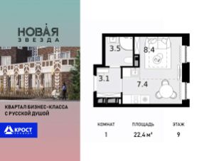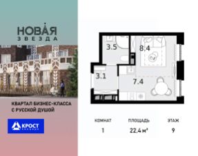 Продаётся 1-к квартира 22.4 кв.м. на 9-м этаже 22 этажного дома, корпус 6 - Резиденция "Хабаровск". Без отделки.