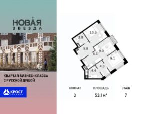 Продаётся 3-к квартира 53.1 кв.м. на 7-м этаже 21 этажного дома, корпус 1 - Резиденция "Вологда". Без отделки.