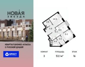 Продаётся 3-к квартира 53.1 кв.м. на 16-м этаже 21 этажного дома, корпус 1 - Резиденция "Вологда". Без отделки.