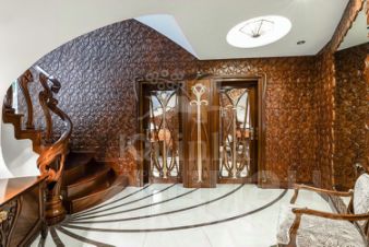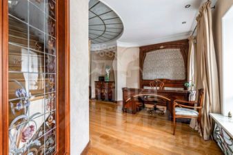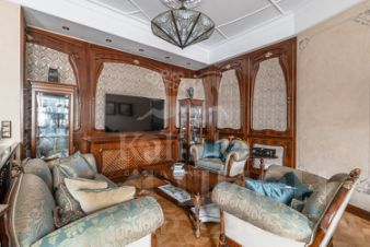 Мебель и порталы изготовлены на заказ в Италии по итальянским эскизам. В оформлении интерьера использована техника "буазери" — сочетание резного дерева и дорогих тканей, придающее пространству особую глубину и элегантность.