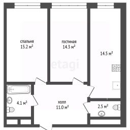 - Планировка линейная. Спальни 15,2 / 14,3 кв.м. Кухня гостиная 14.5 кв.м.
