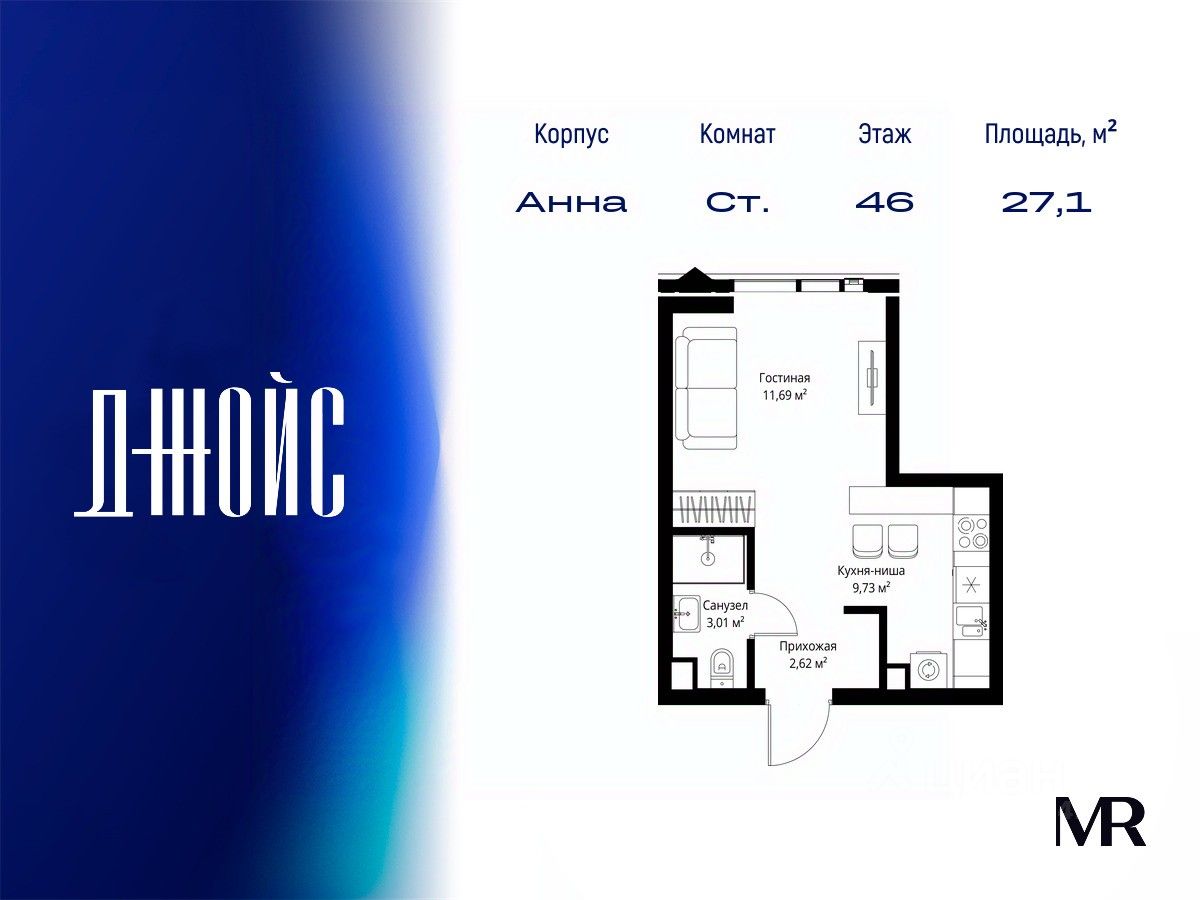 В продаже квартира площадью 27.05 м² с предчистовой отделкой на 46 этаже 55 этажного дома. Квартира расположена в корпусе Анна.