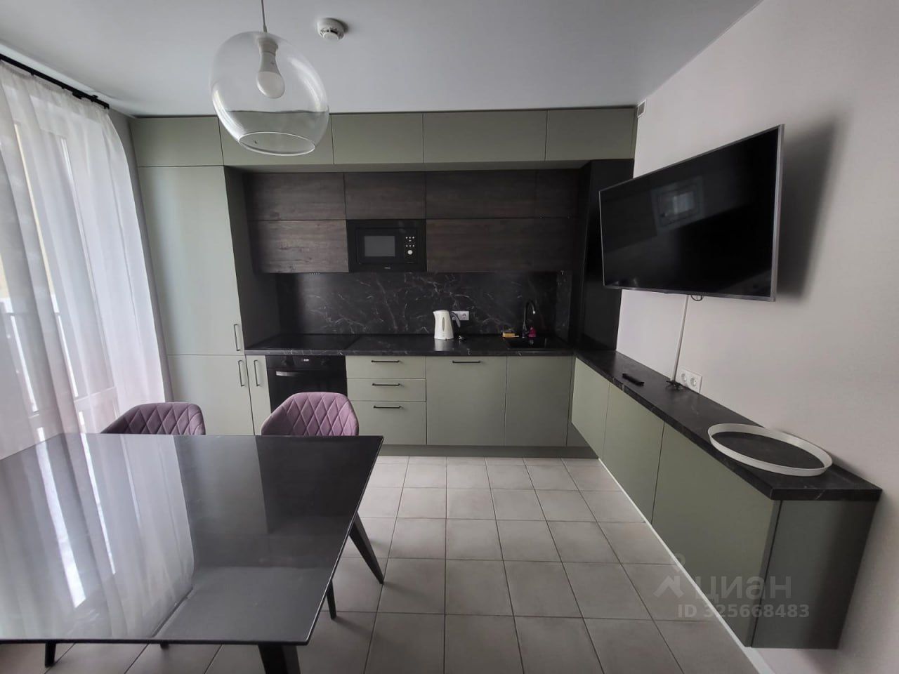 В гостиной установлен кухонный гарнитур с встроенным холодильником, варочной панелью, духовым шкафом, микроволновой печью и вытяжкой, телевизор, стол, 4 стула и диван.