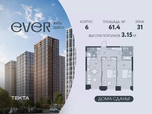 3-комн. квартира в ЖК "Ever" на 31 этаже в 34 этажном здании Корпус 6. Общая площадь: 61.4 кв.м., жилая: 40.3 кв.м. Высота потолков 3.15 м.