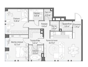 Квартира площадью 100,1 кв. м с окнами на западной и южной сторонах. Панорамные окна в просторной кухне-гостиной улучшают видовые характеристики: растущая у дома зелень и другие элементы продуманного ландшафтного дизайна выглядят особенно живописно. Окна комфортных мастер-спален с отдельными ванными и просторными гардеробными выходят в тихий двор-сад.