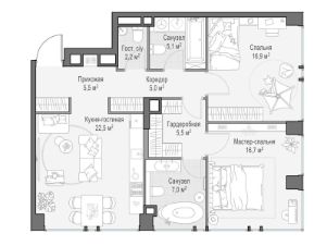 Просторная светлая квартира площадью 86,9 кв. м с окнами на южной и восточной сторонах. Панорамное остекление улучшает видовые характеристики квартиры. Продуманная планировка позволяет разместить две спальни. Мастер-спальня с отдельными гардеробной и санузлом, в котором предусмотрено окно.