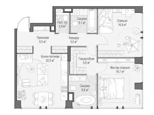 Просторная светлая квартира площадью 87,5 кв. м с окнами на две стороны. Из кухни-гостиной открывается вид на живописный внутренний двор, пруд, а панорамное остекление улучшает видовые характеристики квартиры. Продуманная планировка позволяет разместить две спальни. Мастер-спальня с отдельными гардеробной и санузлом, в котором предусмотрено окно.
