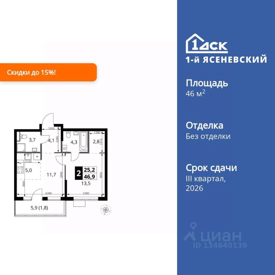 Продаётся 2-к квартира номер 1060 общей площадью 46.9 кв.м. на 6-м этаже 6 этажного здания. Без отделки.