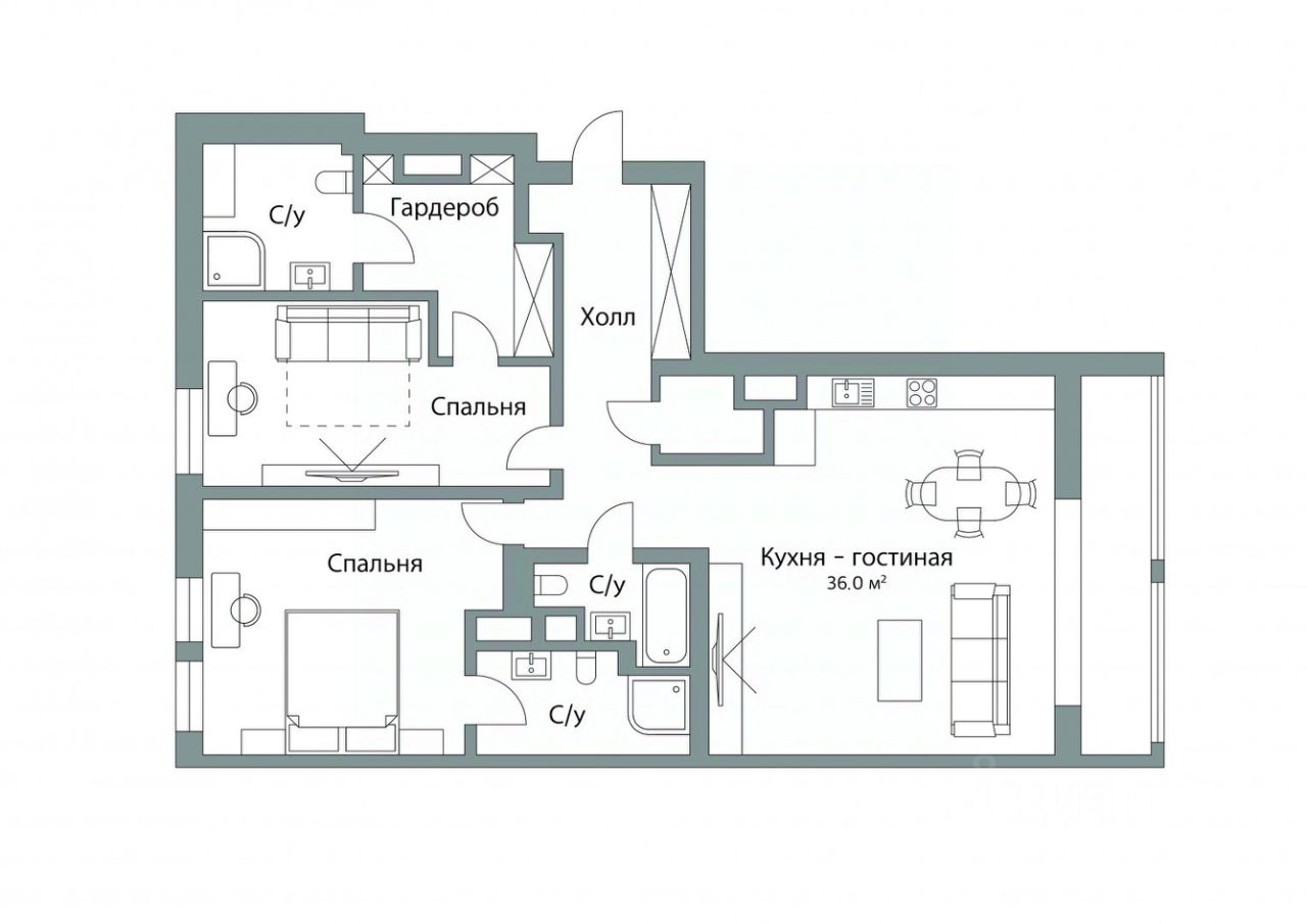 -просторная кухня-гостиная - 36 кв. м.;