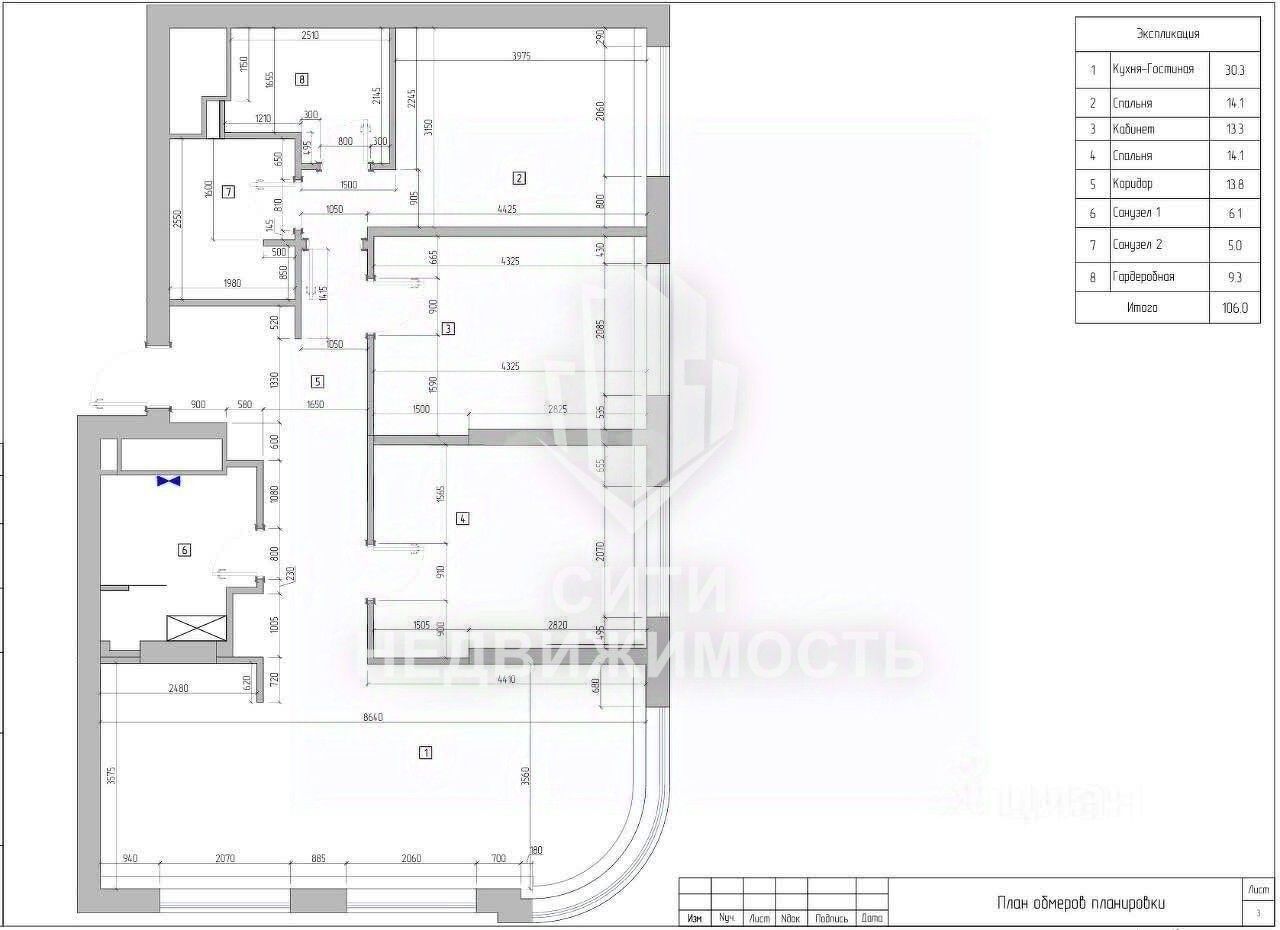 Общая площадь квартиры 106 м2, кухня (10.9)- гостинная 19,4м2 общая площадь кухни-гостинной 30.3 м2. и три изолированные спальни (14,1-14,1-13,3) м2, большая прихожая 13.8м2, отдельная гардеробная комната 9,3 м2, два отдельных санузла - смотрите ПЛАН.