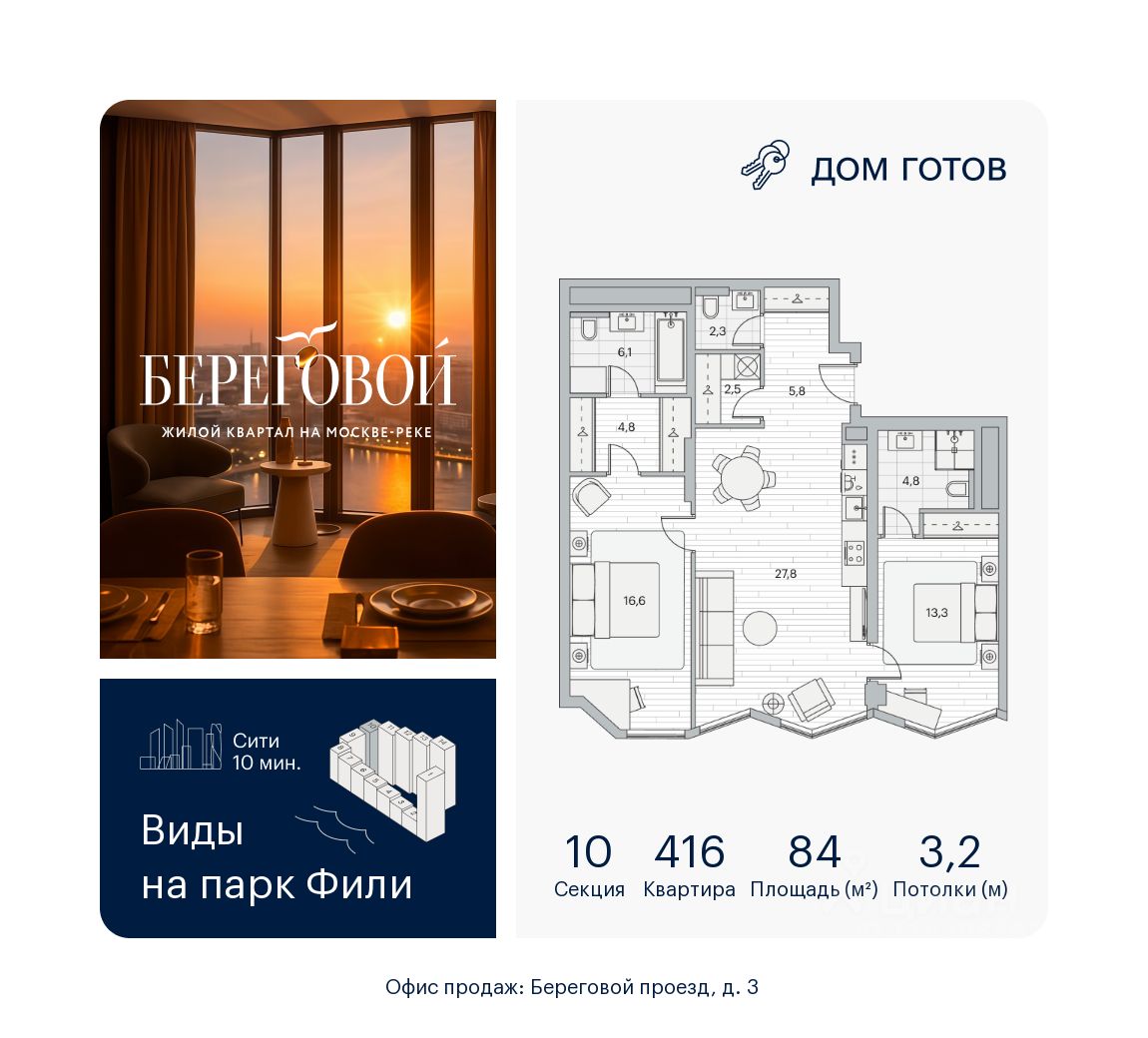 Береговой — квартал курорт в центре столицы. Пешеходная набережная начинается от дома: никаких дорог между вами и рекой. Уникальное сочетание природы парка Фили и ритма Сити.
