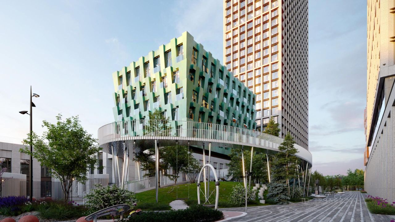 Закрытая территория жилого комплекса, продуманное благоустройство, образовательный центр с детским садом создают приватное пространство для тихой семейной жизни, а городская площадь с фонтанами, ресторан, супермаркет, коммерческая инфраструктура на первых этажах привносят созвучную с ритмом города динамику.