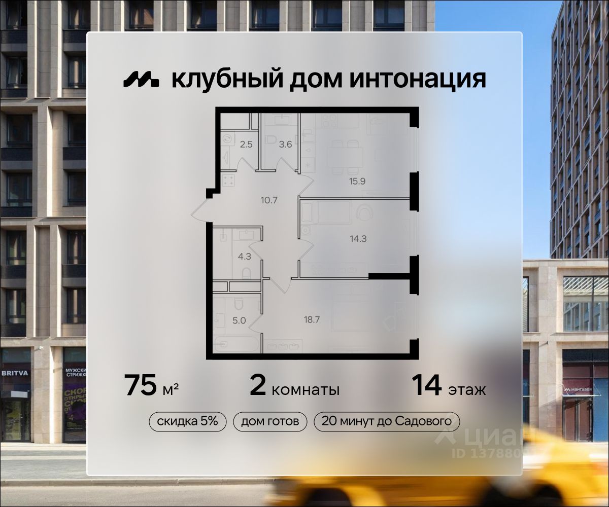 В продаже 2-комнатная квартира в готовом клубном доме бизнес-класса "Интонация". Квартира с высокими потолками с мастер-спальней, просторной кухней и постирочной.