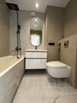 Санузел полностью оборудован: установлена новая сантехника — ванна с душевой системой, подвесной унитаз с инсталляцией, раковина с тумбой и зеркалом;