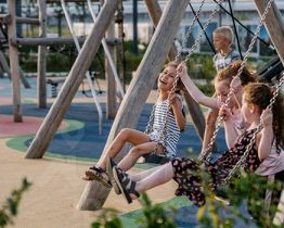 Все корпуса в квартале гармонично сочетаются, образуя единую городскую среду. Между собой их объединяет невысокая этажность и натуральная цветовая гамма. Здесь приятно гулять и проводить время на улице всей семьёй.