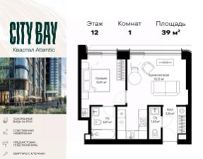 Продаётся 1-комнатная квартира общей площадью 39 м² с предчистовой отделкой в ЖК City Вау на 12-м этаже 53 этажного дома.