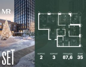 В ЖК SET продается 3-комнатная квартира площадью 87.60 м², расположенная в корпусе 2, на 35 этаже 59 этажного дома.