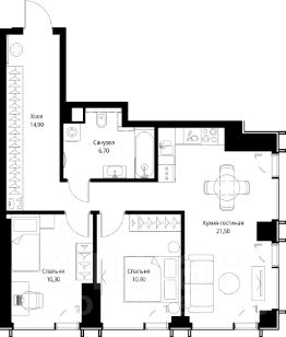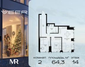 Продаётся 2-комнатная квартира общей площадью 64.30 м² без отделки в ЖК VEER на 14-м этаже 59 этажного дома.
