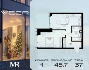 Продаётся 1-комнатная квартира общей площадью 45.70 м² без отделки в ЖК VEER на 37-м этаже 59 этажного дома.